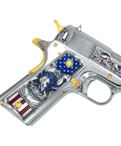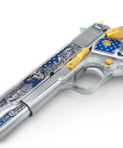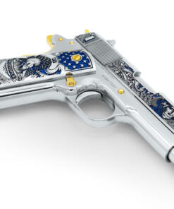 Its slide is masterfully engraved with an effigy of George Washington, the American flag, thirteen stars, and the heraldic eagle—each symbol carved in deep relief and accented with hand-applied red and blue inking that echoes the nation’s banner. This is not merely a firearm; it is a tribute in steel—an heirloom for patriots, a statement of purpose, and a crown to liberty itself.