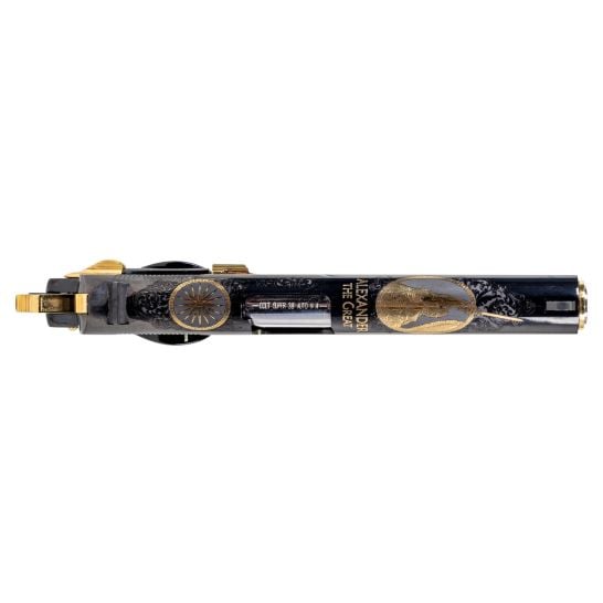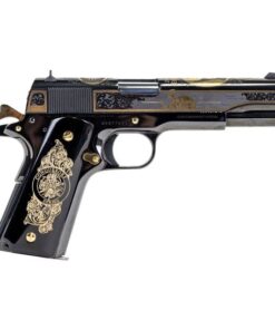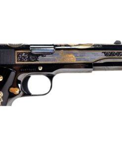 The Colt 1911 Conquerors Series, chambered in the powerful .38 Super Auto +P, stands as a testament to both historical artistry and modern firearm engineering. This limited-edition pistol, one of only 200 produced, showcases a stunning Royal Blue polished finish, meticulously engraved with an Alexander the Great theme, featuring battle scenes, followers, a spear, and a shield, all accented with a striking Greek key in gold. The 5-inch rifled barrel ensures precision, while the 9-round single-stack magazine provides ample capacity. This 8.5-inch overall length, steel-framed masterpiece boasts both thumb and grip safeties, along with a reliable external hammer firing system. Black engraved grips complement the highly polished, engraved slide, and the fixed rear sight paired with a blade front sight allows for quick target acquisition. Weighing in at 35 oz., this Colt 1911 delivers a balanced feel and exceptional performance. Included is a cable trigger lock for added security. Ideal for collectors and enthusiasts seeking a unique and powerful firearm, the Colt 1911 Conquerors Series is a true collector’s item, combining historical significance with unparalleled craftsmanship.
