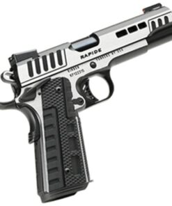 The RAPIDE (SCORPIUS) (DN,NS) is a one-of-a-kind 1911 designed for both performance and aesthetics. Featuring stepped cocking serrations and slide lightening cuts, it ensures faster slide lock-up, enhancing the pistol’s speed and reliability. The DLC-coated barrel offers exceptional durability, capable of withstanding heavy use while maintaining peak performance. Equipped with Kimber Stiplex front strap stippling, it provides a secure and confident grip, while the Black G10 Rapide patterned grips add an extra layer of control and comfort during handling. The KimPro Black finish, combined with brush-polished flats, gives the RAPIDE (SCORPIUS) a striking and sophisticated appearance that stands out in both form and function.