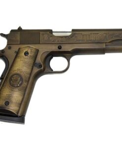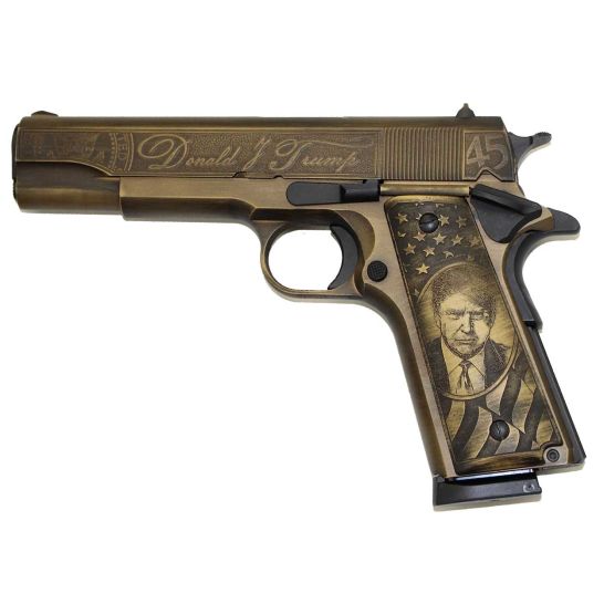 The iconic U.S. Army 1911A1 .45 ACP pistol that served our troops faithfully for decades has been reproduced by SDS Imports. It is a classic handgun in distressed bronze dawning our 45 president Donald J. Trump.