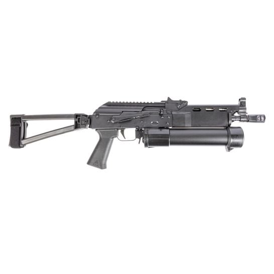 Introducting the Soviet Arms AK-V ” Stizon”. In collaboration with Stuff and Things Inc., this AK-V has been transformed into a pistol reminiscent of the Russian PP-19 Bizon. The AK-V “Stizon” features a helical 55 round magazine, as well as a Bizon-style handguard. This pistol also retains the core AK-V features with a blowback-operated system and a hammer forged front trunnion and bolt/carrier.